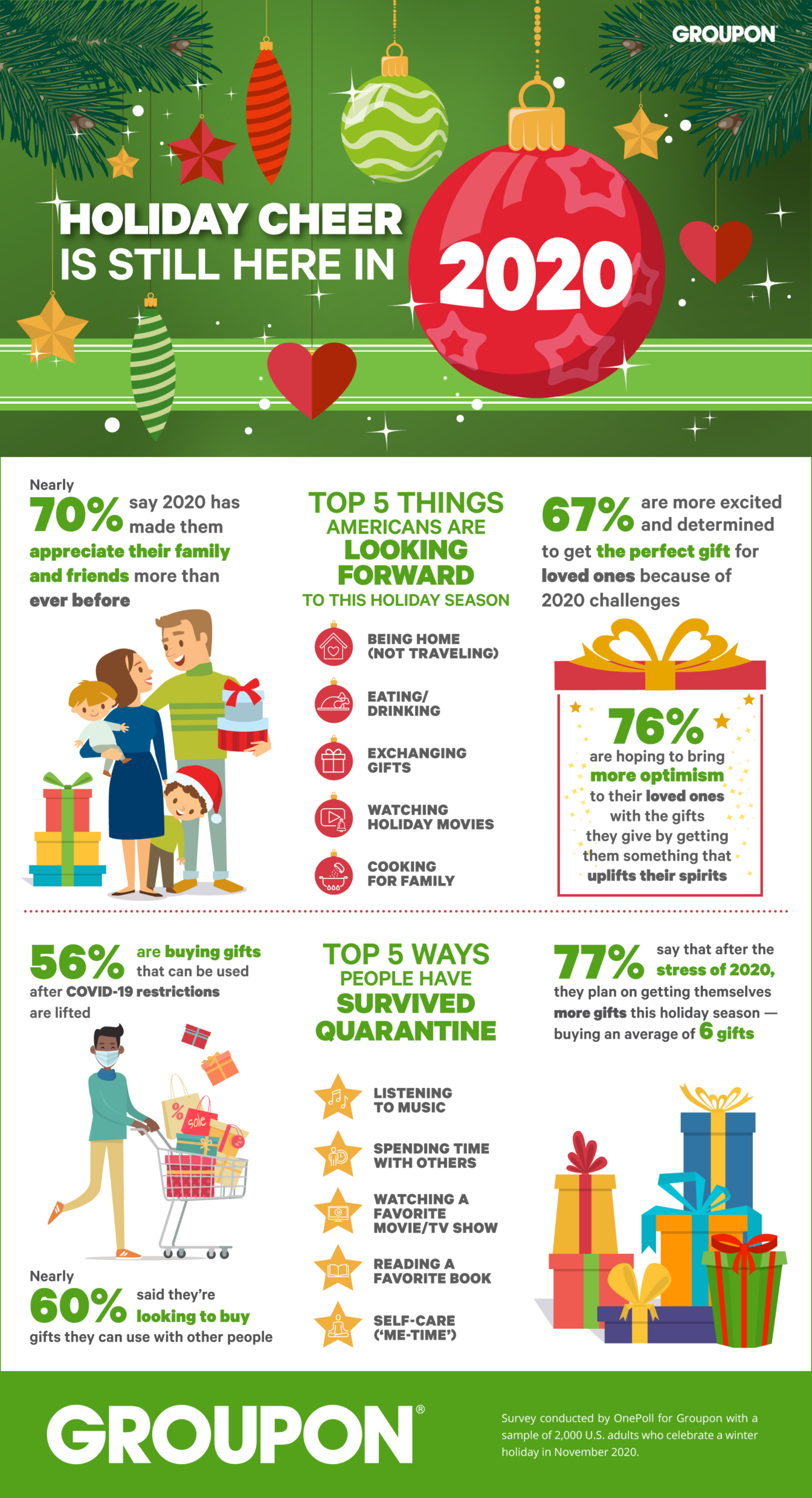 The survey, commissioned by Groupon, polled 2,000 people from around the United States to find out how the pandemic and other events have impacted holiday gifting trends. The study also looked at how people are changing their approach to celebrating this year and what they’re looking forward to the most over the next few weeks.