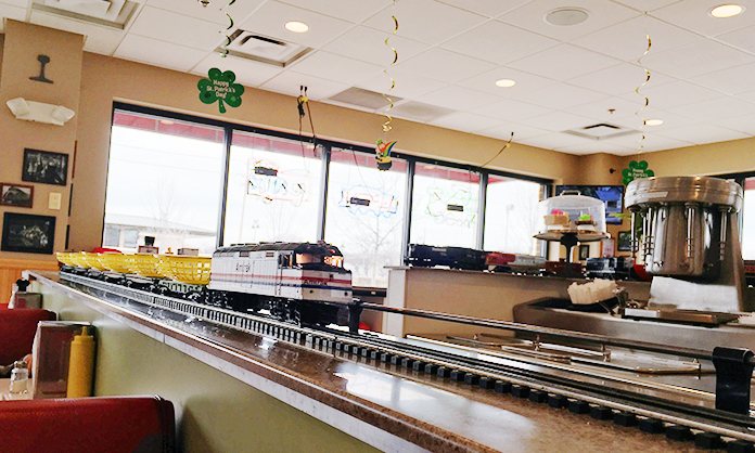 The train rolls past every seat in the house, and it runs constantly, never stopping unless there's food to deliver. But make no mistake—that is no toy train. It's a detailed scale model, the kind that aficionados collect and trade. The one running the tracks when we visit is a commuter Amtrak engine, looking just as authentic as the one that stops at the Metra station across the street. "Lots of people take the train in from the city and then come here, make a day of it," says Dale.