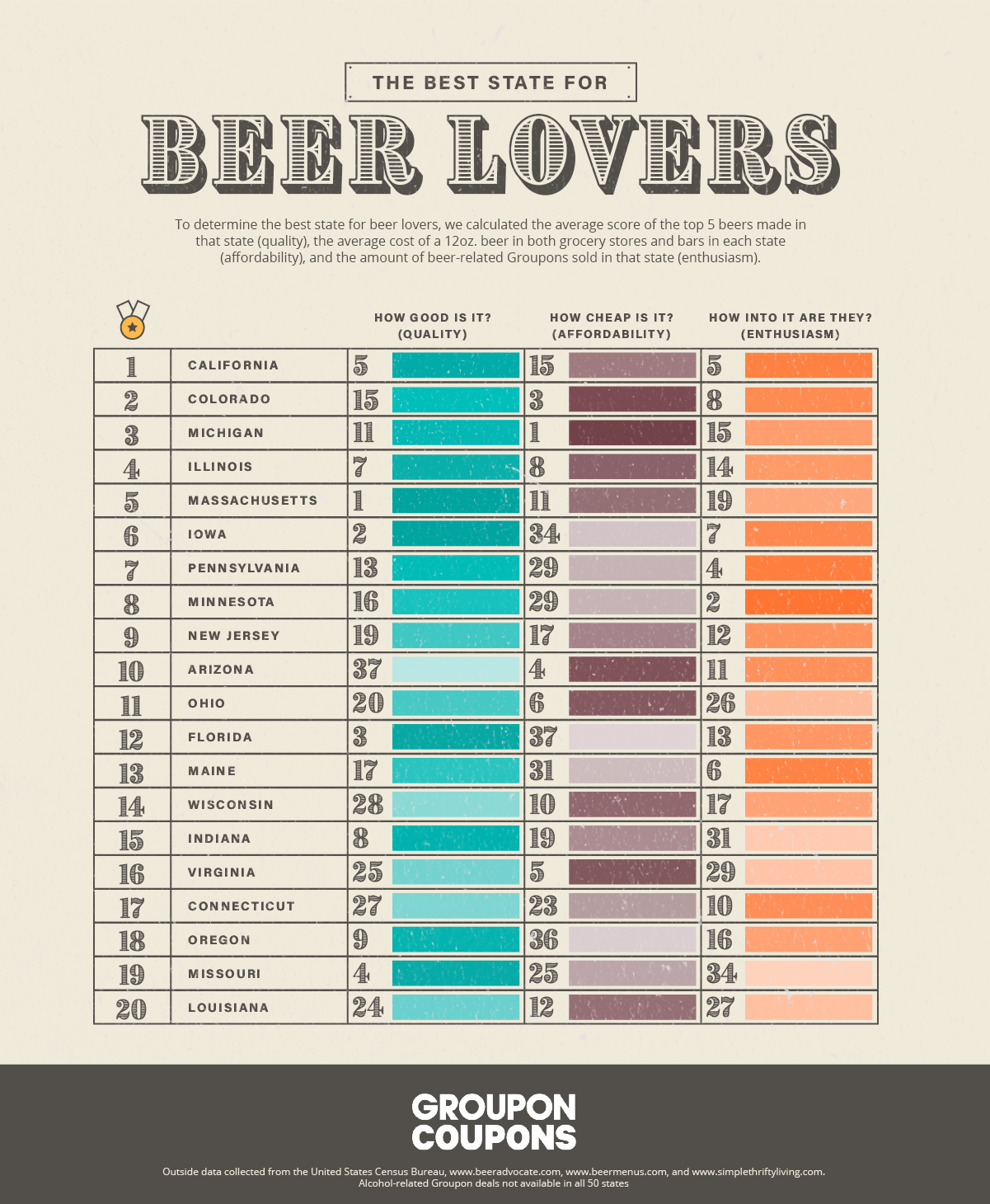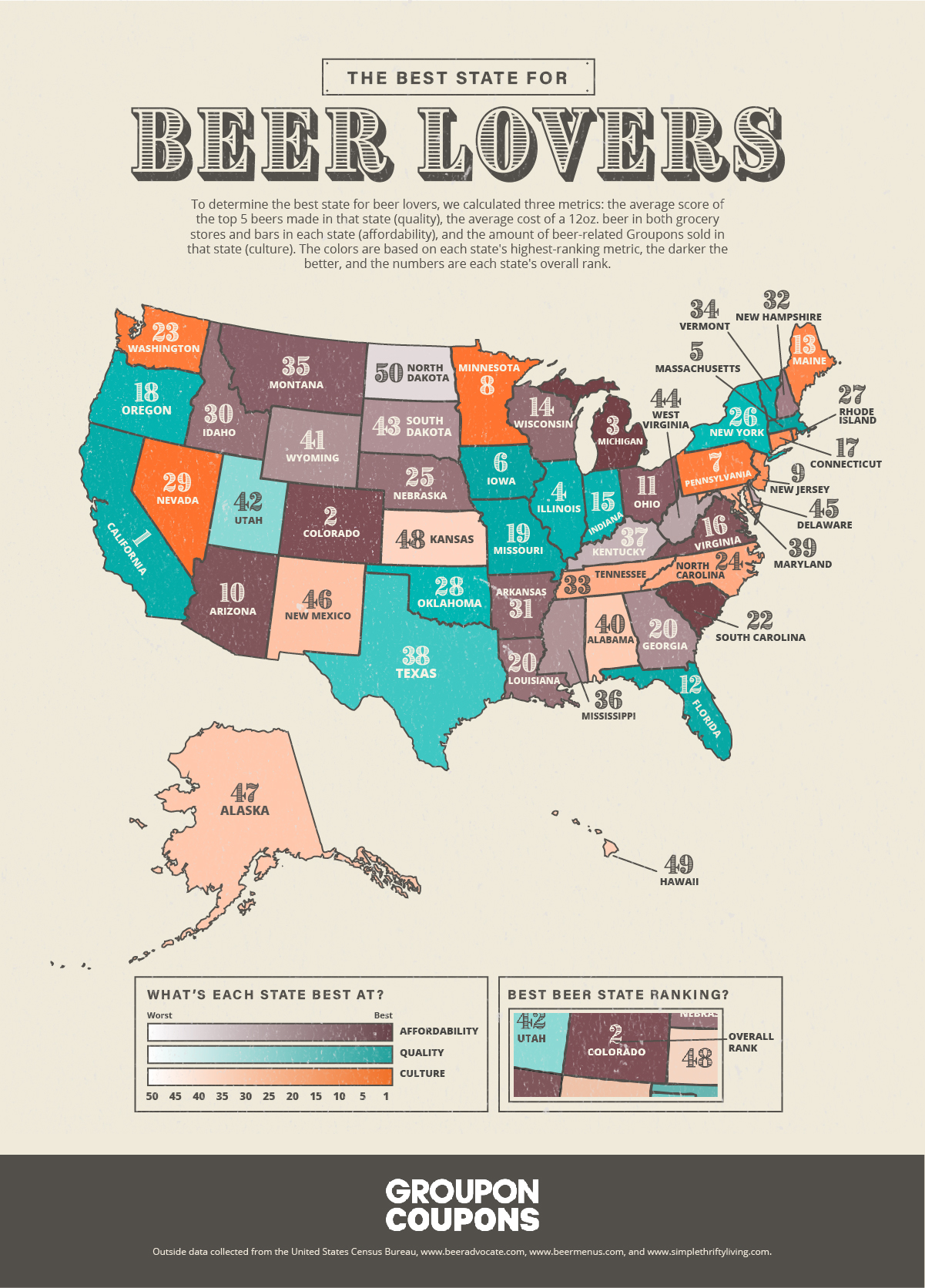 To figure the Best State for Beer Lovers, we here at Groupon Coupons looked at reams of publicly available data and proprietary Groupon data. From there, we calculated three metrics: the average score of the 5 best-tasting beers made in that state (quality), the average cost of a 12oz. beer in each state (affordability), and the number of beer-related Groupons sold in that state per 1,000 people (enthusiasm).