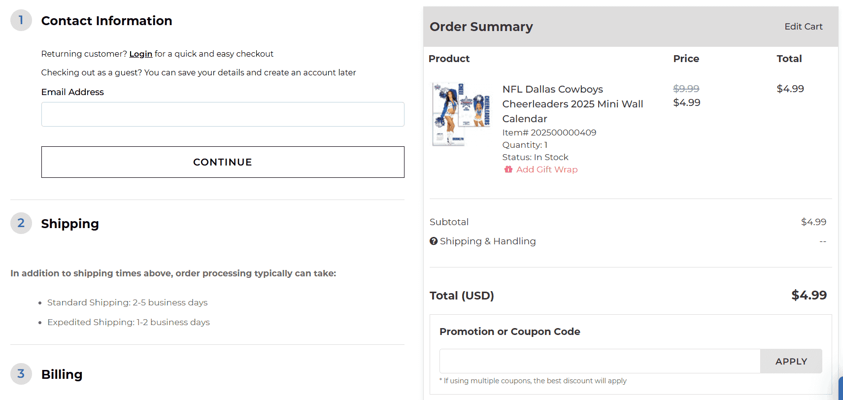 Have questions about a promotion or need assistance with your order? Calendars.com's customer service team is ready to help. You can reach them by phone at 1-800-366-3645, Monday through Thursday from 8 a.m. to 5 p.m. CST. For quick responses, try their live chat feature available during the same hours. Alternatively, send an email to gethelp@calendars.com for support at any time.