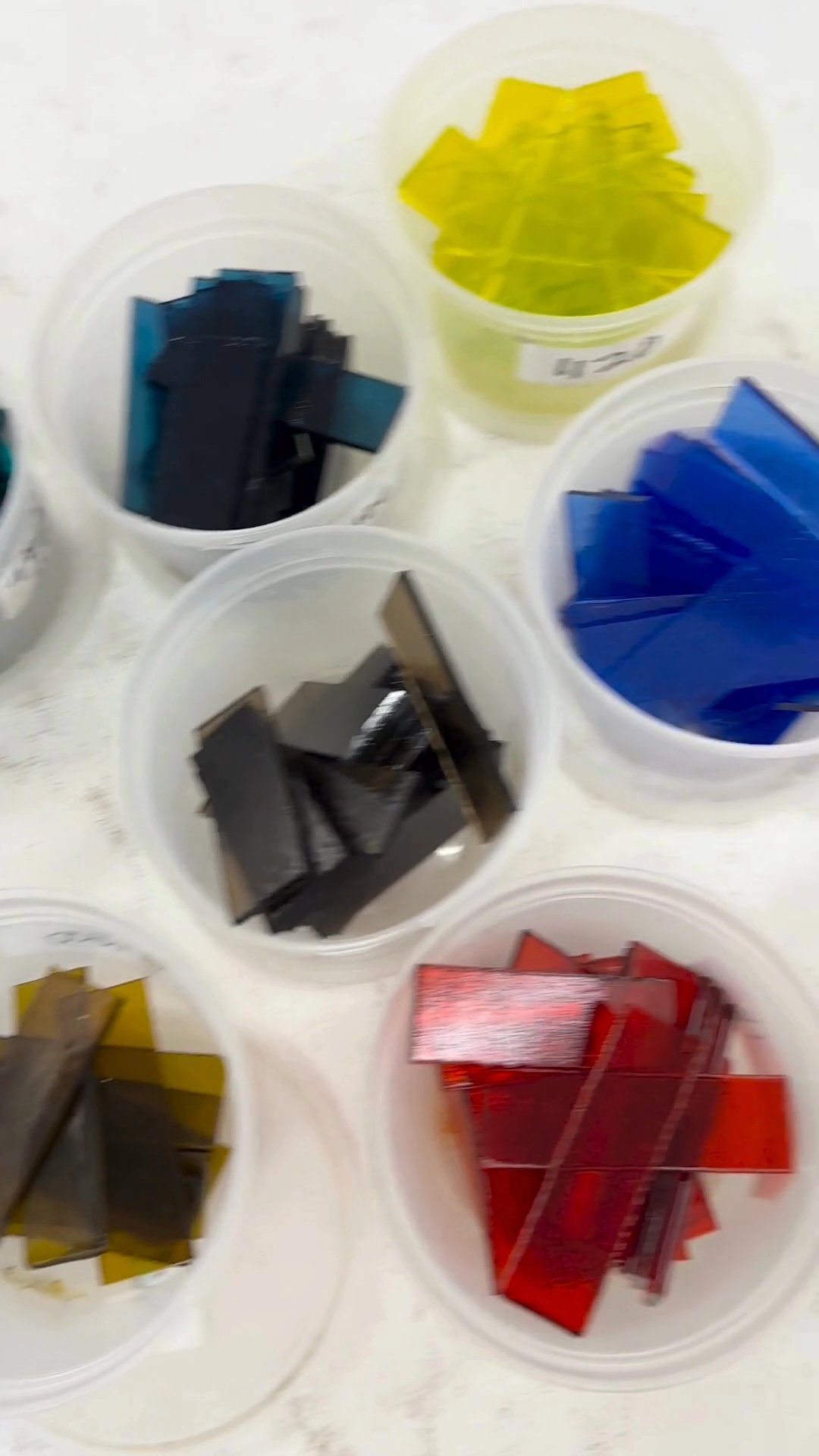 Get guided through a glass art workshop, cutting and collaging colored glasses to create your own fused glass plate