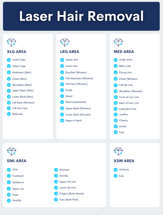 Under Arms Bikini Line Thong Line Chest (Women) Full Ab Line Shoulders (Women) Front of Hair Line Back of Hair Line Extended Chin Jawline Cheeks Hands Feet
