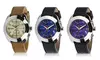 Chronograph watches with colored dials and gleaming stainless cases contrasted by leather bands with double stitching for a modern look