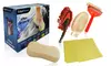 Kit helps car owners keep their ride spotless with dust brush, sponge brush, window squeegee, wipe cloth, and hand mitt