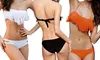 Bikini provides moderate to full coverage while exuding style with a tie-back top and fringe details that elongate the torso’s appearance