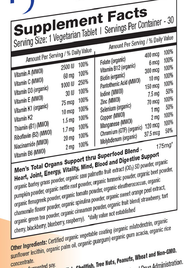 - Complex of 15 organic certified super foods for men’s total organs support