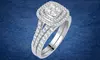 Ring features a square cluster of round-cut diamonds at the center surrounded by sparkling accent stones; wedding band complements the ring