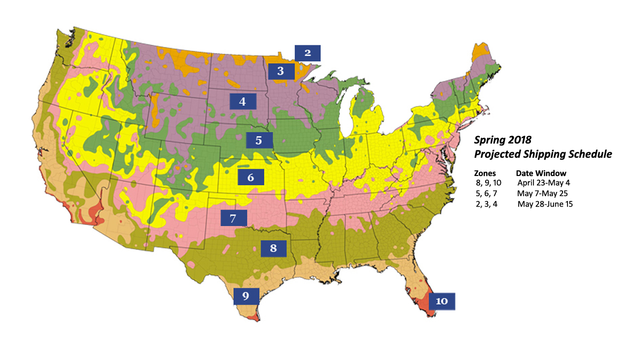 - Plant shipping will begin on 4/23/18 and is subject to climate zone and optimal planting conditions. See shipping schedule.