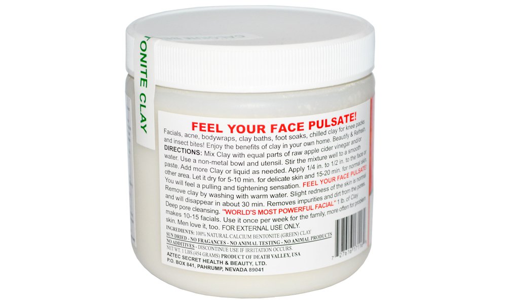 Mix Aztec secret Indian healing clay with equal parts of apple cider vinegar or water.its best to use a glass, pottery or wooden bowl. Stir the mixture until is a smooth paste-add more clay or liquid as needed. Apply a 1/8 inch to 1/4 inch thick layer of clay to the face or other areas and let it dry. Drying times vary, but times are generally 5 minutes of delicate skin and 15-20 minutes for normal skin. You will feel a pulling and tightening sensation, deep pore cleansing! Remove clay by washing with warm water. A slight redness may appear after removing the clay. This is normal and will disappear in approximately 30 minutes.
