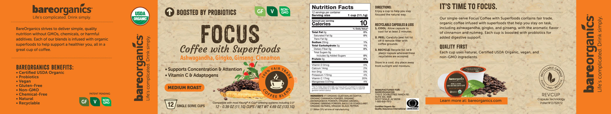 BareOrganics FOCUS COFFEE with Superfoods 12ct Single Serve Cups (ORGANIC) Caffeinated 12ct