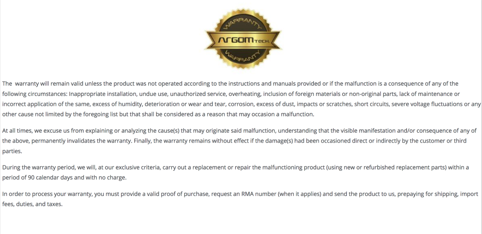 • Lifetime warranty from Argom Tech