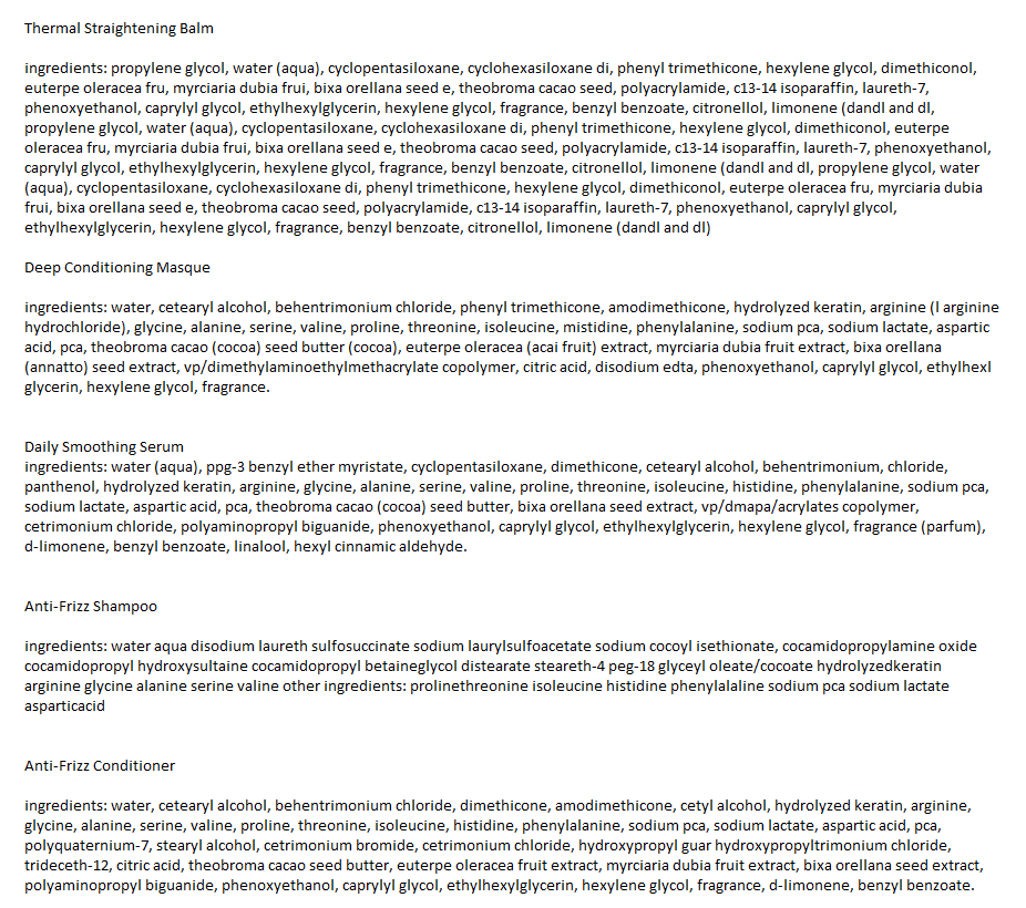 - 5-piece set (shampoo, conditioner, straightening balm, masque, and smoothing serum)