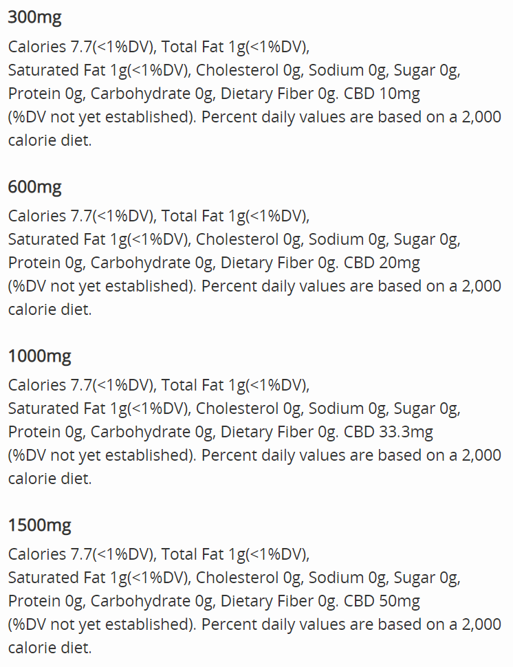 - CBD content: 300mg, 600mg, 1000mg or 1500mg