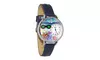 Beach themed Whimsical Watch features miniature flip-flop sandals, sunglasses, seashells and starfish, arranged on a sandy beach, under a bright blue sunny summer sky. Perfect for the beach lover, it’s a colorful reminder of summer beach fun. Made by a team of artists and graphic designers using hand-crafted miniatures, Whimsical Watches are wearable works of art.