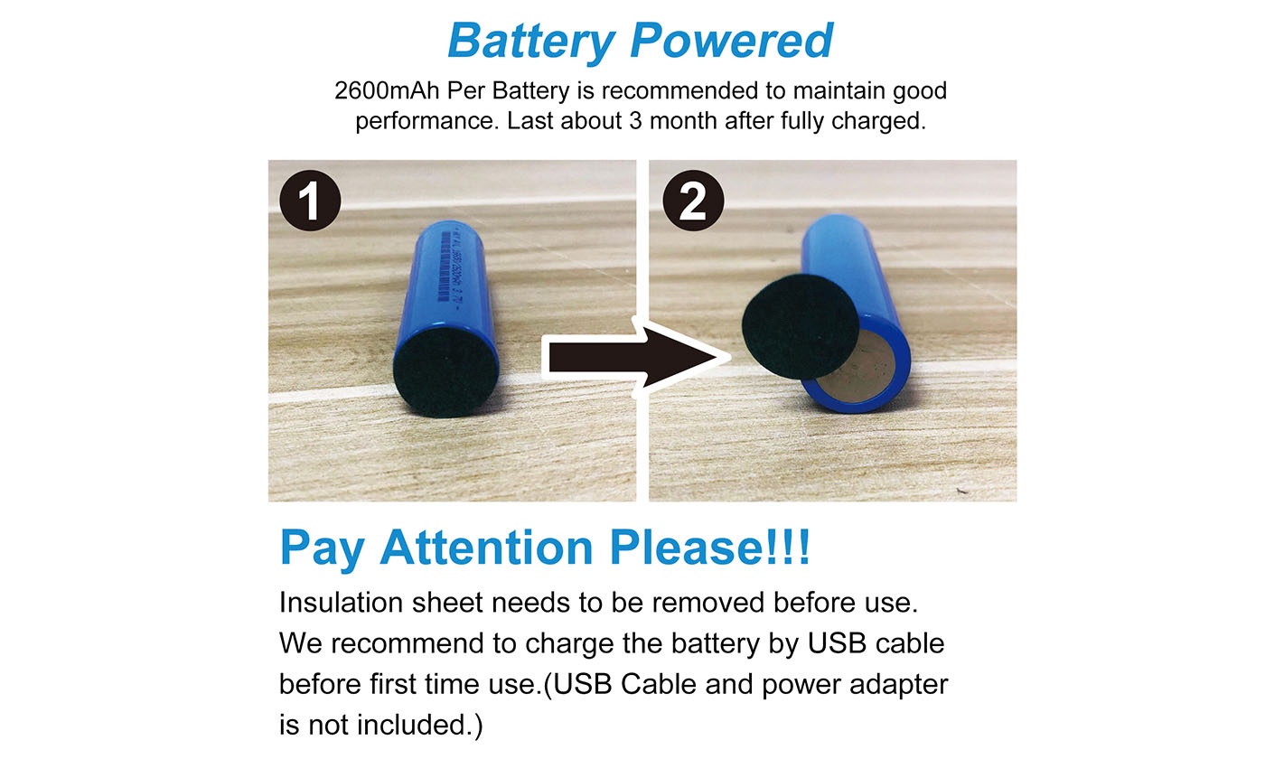 - Powered by: USB cable, two 18650 Lithium batteries (included)