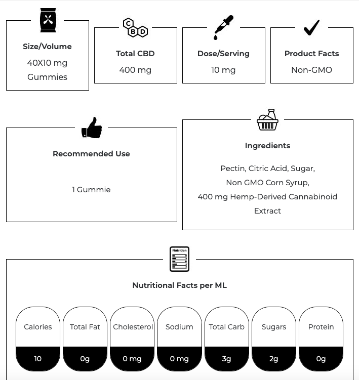 • Serving size: 1 gummy (10mg of CBD)