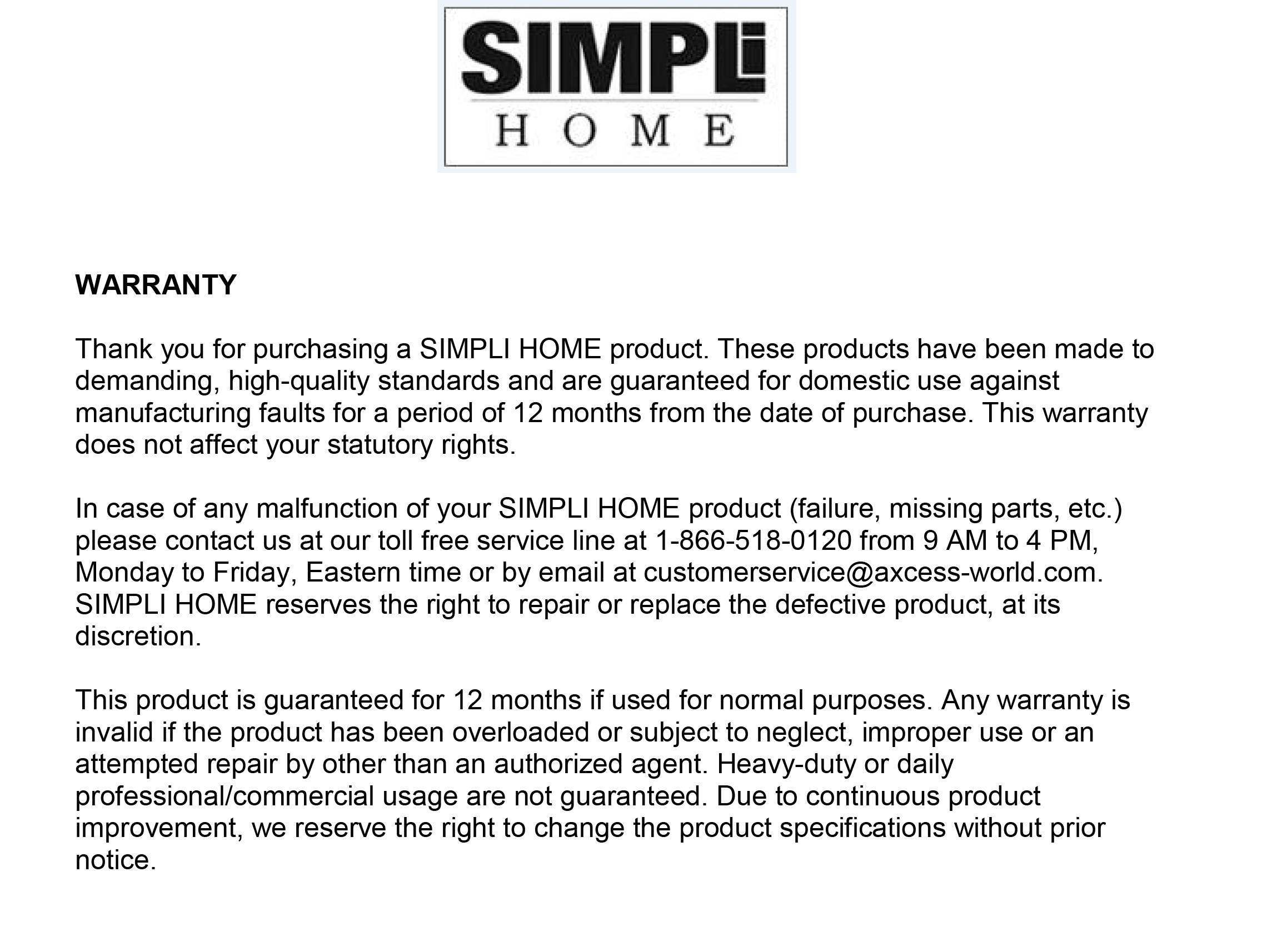 - Warranty: 1 years parts warranty provided by Simpli Home.