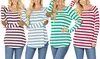 Women's Striped Long Sleeve Boat Neck Top with Elbow Patch. Plus Sizes Available.
