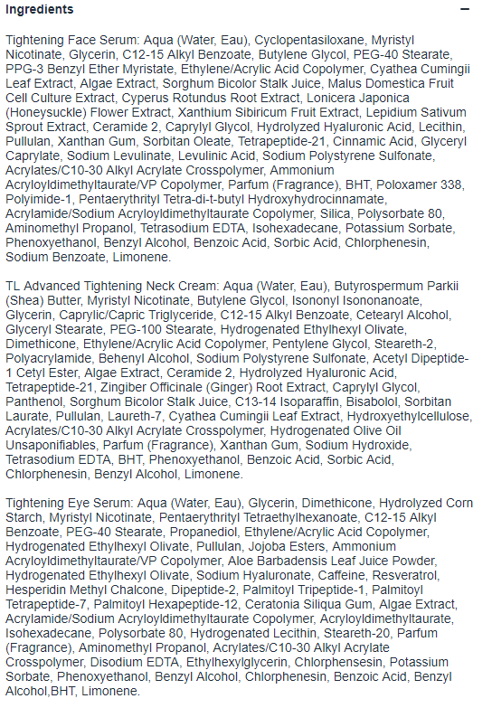 - TL Advanced Tightening Neck Cream: Apply to clean skin on neck and jawline in the AM and PM. Gently massage in with an upward motion.