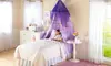 A moon and stars dangle from a purple-toned canopy, which can make children feel like princesses as they fall asleep beneath it