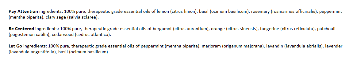 - Pack includes 3 bottles of essential oils: Pay Attention, Be Centered, and Let Go