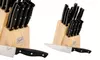 18 stainless steel blades rest in designated slots within a natural wood block; full tang construction and double rivets for longevity