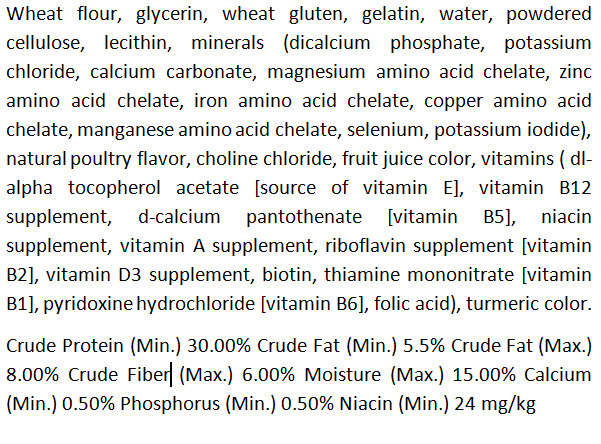 - Ingredients: wheat flour, glycerin, wheat gluten, see the full ingredients list