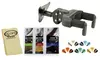 Wall-mounted guitar holder plus picks, polishes, and a cleaning cloth
