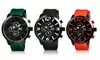 Men’s watches with sporty silicone or polyurethane straps and black or gray dials with three subdials and luminous hands