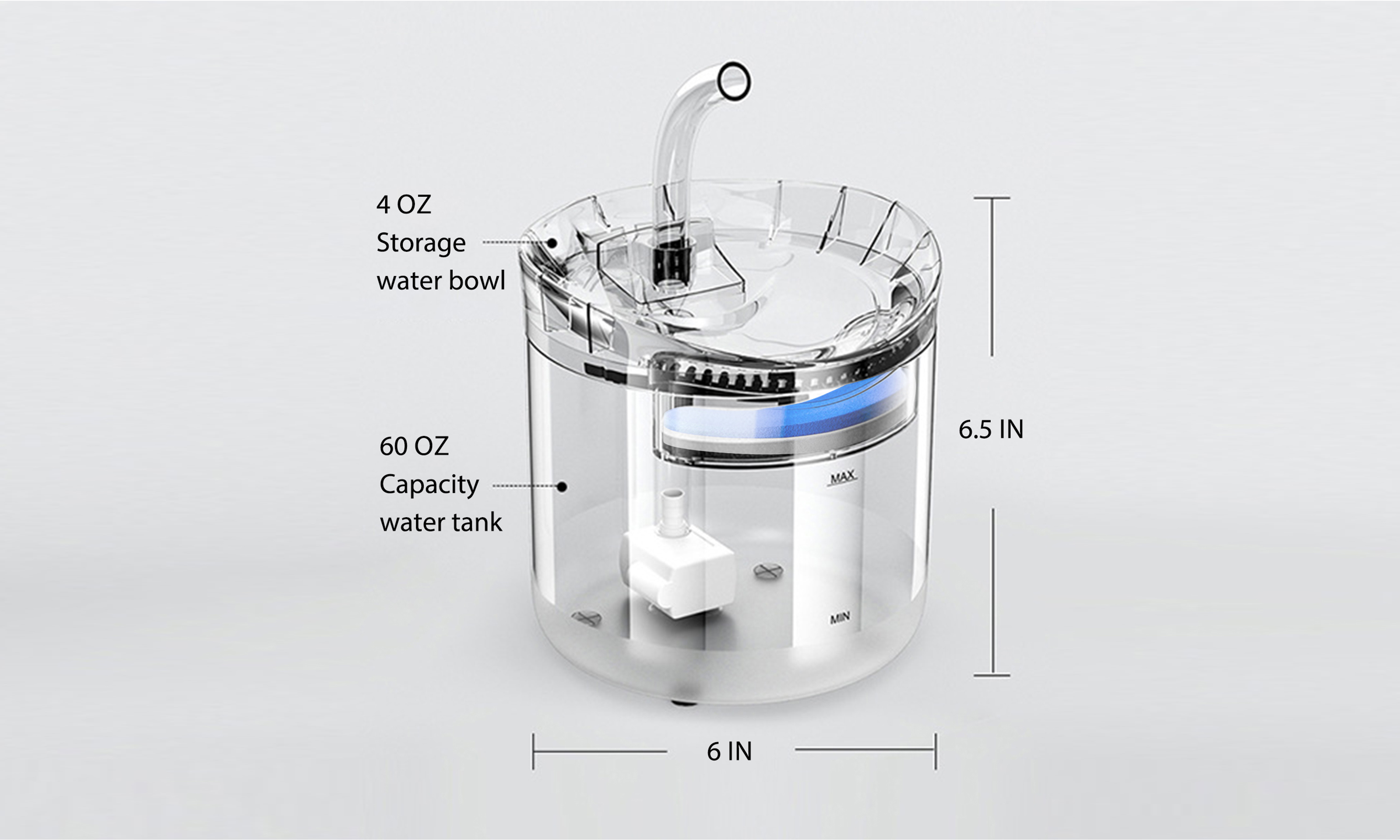 DescriptionEncourage Drinking & 2 Flow ModesA detachable faucet can change the water flow mode of this cat water fountain: Faucet mode and fountain mode. No cat can resist the temptation of a faucet, it's a fun way to attract your pets to drink more water to keep healthy.BPA Free Material & Powerful FiltrationOur cat water fountain is made of high-quality PC, BPA-free, non-toxic and odorless, which can be used safely and securely. This water dispenser is also equipped with multiple filtrations composed of a cotton layer, high-density and high-content activated carbon and an ion exchange resin,which can effectively maintain water quality. Recommended changing the filters every week.Ultra Quiet & Pet-Friendly DesignLow consumption detachable water pump, super quiet and work noise less than 40dB. Our water dispenser allows you to adjust 3 kinds of water flow by adjusting the valve in the water pump. 6° round slope design and friendly height will not hurt your cats, they can drink water in the most comfortable position, reducing pressure on pet's cervical spine and not wetting pet's chin.Super Easy to Install & Clean - Fully TransparencyThis simple quick-release structure is designed for easy removal and cleaning, and the transparent design of this water fountain makes you clearly know the water level and cleanliness, convenient for you to add or change the water and clean the water fountain in time.Large Capacity & Multiple Pets SuitableThe 61-ounce capacity water fountain suitable for one water change cycle, neither leaving a large amount of water nor making the frequent water filling cycle. The water in the water dispenser can maintain its freshness in a suitable change cycle. The carbon filter, sponge filter and fountain pump work fine together so your pet will always drink filtered and clean water.How to use it1. Take out the filter and soak it in a nomal temperature water for 10 minutes before use.2. Place the soaked filter into the filter tray, the blue sponge should be placed faced up.3. Install the filter tray uder the water tank cover.4. Install the water pump at the position that maded a frosted mark in the water tank, and press the cord into the storage slot behind the tank.5. Add water between the MIN and MAX indicator, aligh the water outlet the pump and cover the water storage cap.SpecificationMaterial: Food-grade PCFilter Material: Sponge + Ion Exchange Resign + Activated CarbonColor: TransparentMaximum Capacity: 1.8L /61 ozVoltage/Current: 5V/100mAWeight: 600g/1.3 lbDimensions: 6.5*6.5*6.1 inchPackage includes1 x Pet Water Fountain1 x faucet1 x DC Pump (with a 6ft power cord)1 x Filter1 x Instruction ManualImportant Reminders:Note1. For the health of your pet, it is suggested to change the water and clean the fountain every week.2. Sometimes loud fountains are the consequence of a low water level or a dirty impeller. The water pump can be disassembled, clean your fountain’s impeller and ensure the water reaches to at least the minimum level in the water bowl.4. According to your pet's drinking frequency and the number of pets using the fountain, replace the filter and the sponge every 3 to 4 weeks.5. Please place the pump inside the square frosted mark and make sure the water pipe of cap aligh the water outlet the pump.6. Please keep the cable hidden to prevent pets from chewing it.