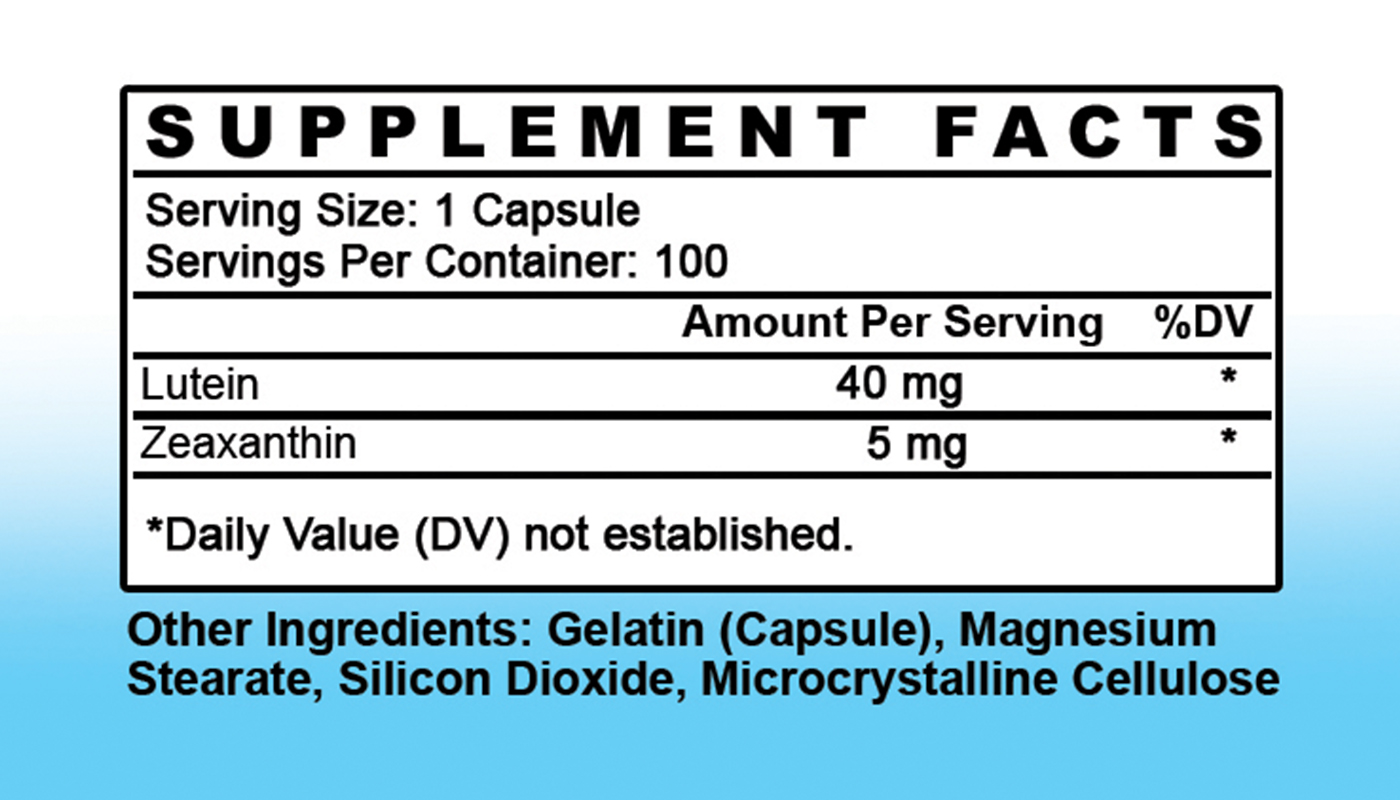 100 Nutrition Vision Supplement with Lutein and Zeaxanthin (100-Count)Potential BenefitsContains antioxidants, lutein, and zeaxanthinPromotes healthy vision and supports the eye healthProvides support to the cardiovascular healthCan protect eyes from oxidative damagesSpecifics100 capsulesServing size: 1 capsuleSupplement factsMade in the USA