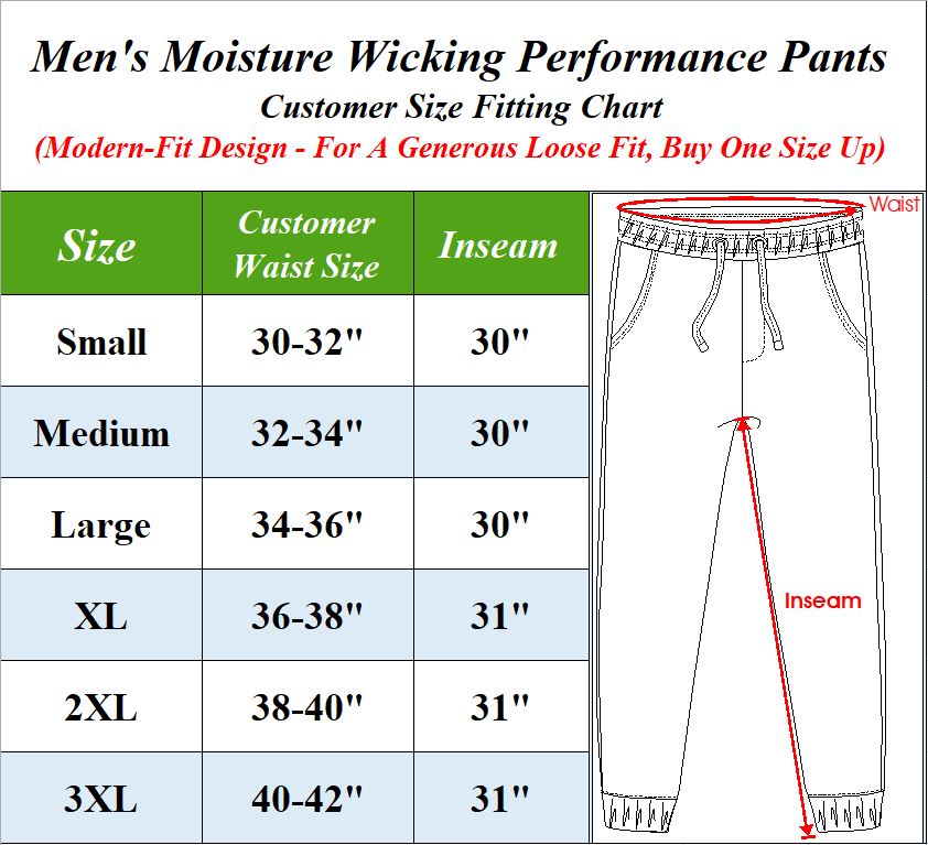 3-Pack Dry Fit Moisture Wicking Performance Active Pants Modern-Fit Design - For A Generous Loose Fit, Buy One Size Up Moisture Wicking Technology To Stay Cool & Dry Odor Resistant Fabric Breathable, Sweat-Proof & Quick-DryElasticized Waistband With Adjustable Drawstring For Desired Comfort 2-Side Pockets, No Back Pockets Double Stitched Hem Imported Materials: 100% Polyester Care Instructions: Machine Wash Cold Size Reference: Model is 6-Feet, 1-Inch & is Wearing a Size Medium