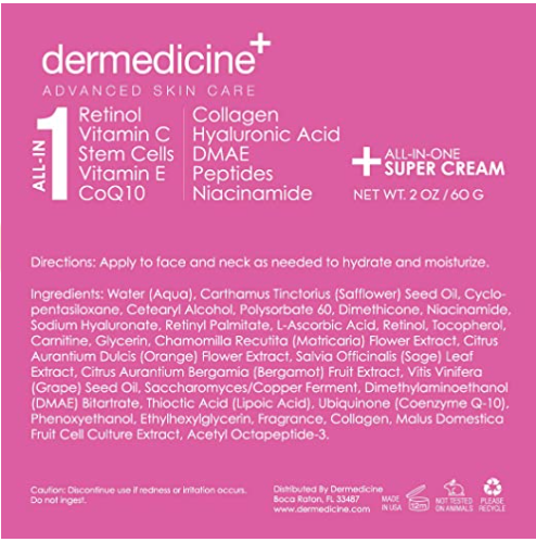 - Included in the box: Dermedicine All-in-One Super Anti-Aging Cream with Retinol 2oz (1pack or 2pack)