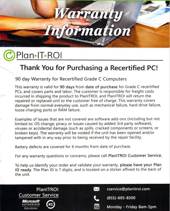 - Warranty: 90 days parts-and-labor warranty provided by PlanITROI.