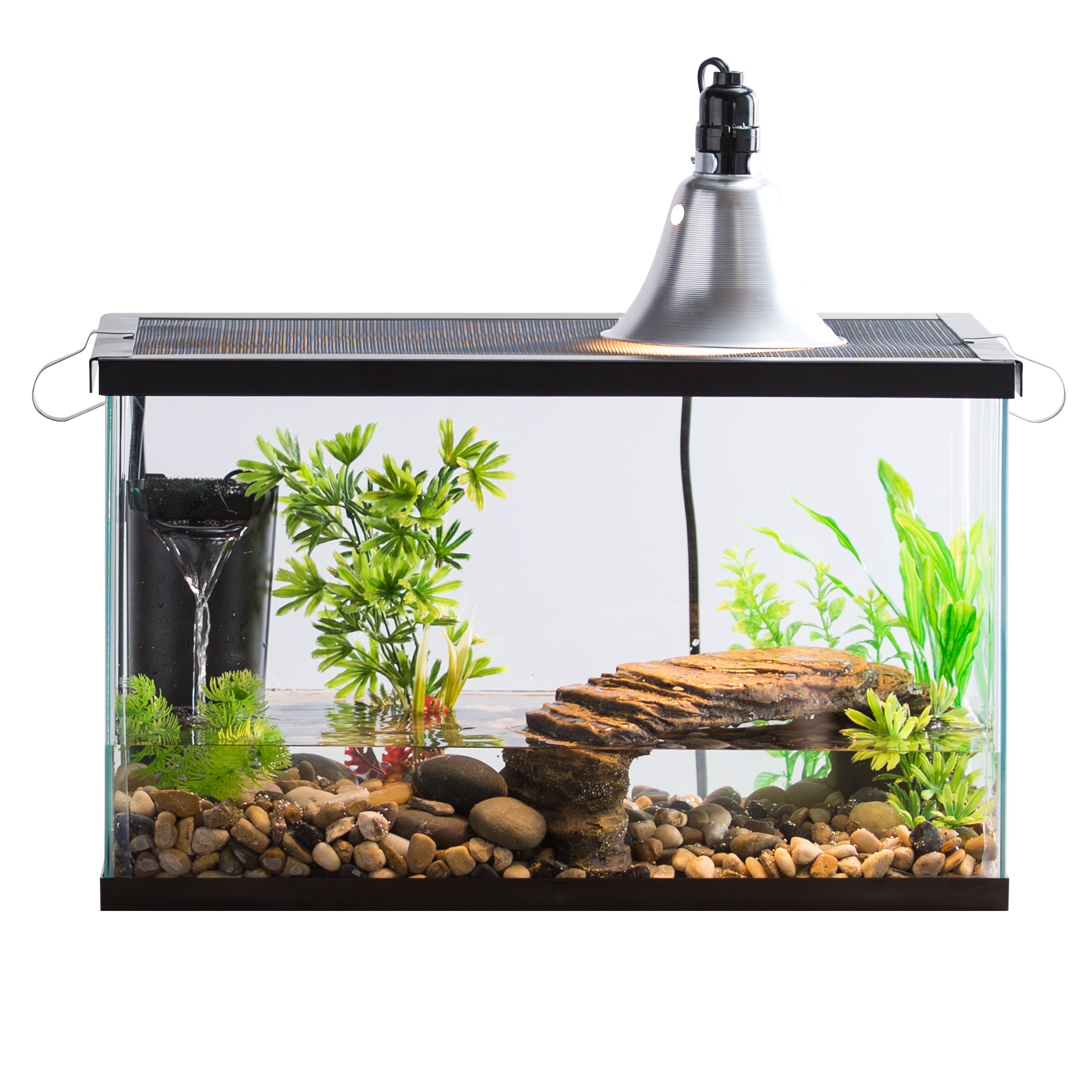 Keep your pet reptile comfortable with this 10-gallon habitat starter kit from Aqua Culture. The see-through glass makes it easy to watch what your pets are doing, and with the locking screen lid, you won't have to worry about them escaping or anything getting to them. Your reptile will enjoy soaking up the rays in this natural-looking habitat that includes a basking platform. It also features a convenient hiding spot and gradual stair steps for easy climbing. The dome lamp has a 60W heating bulb that'll help keep your little creature warm. Your pet can enjoy swimming around in or drinking crystal-clear Tetra Whisper-filtered water as well. Some tasty ReptoMin food and helpful TetraCare support information are included with this kit so you can set up and maintain your little reptile's home.