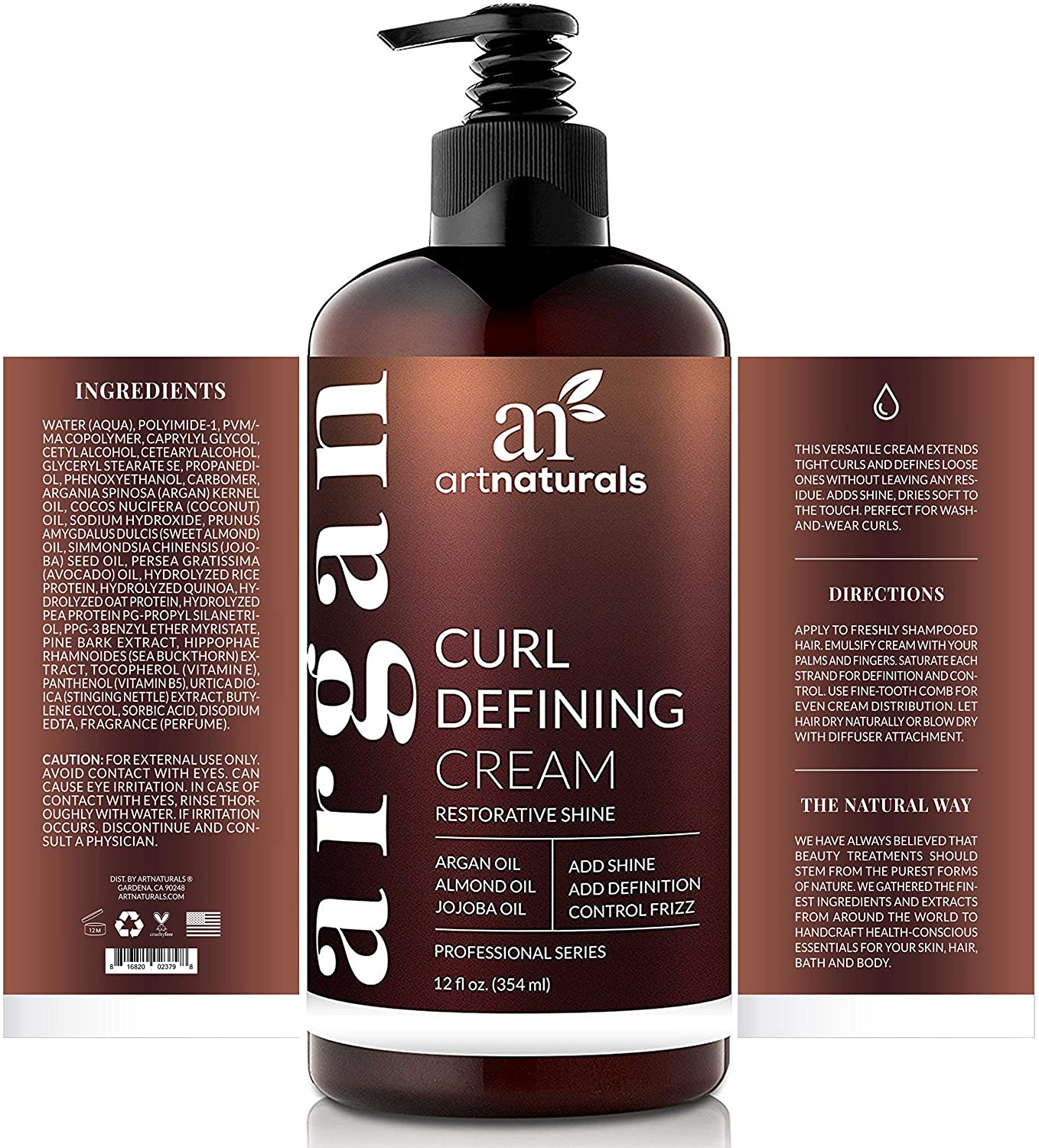 Artnaturals Curl Defining Cream gives your curly hair the definition, control and shine you want, without the crunchiness and stiffness you don’t. Banish frizz and flyways with the Cream’s professional-grade combo of argan oil, avocado oil and jojoba oil, which heal and soften for wash-and-wear hair that makes you smile.This professional series Cream combines argan oil, avocado oil and jojoba oil to sooth and hydrate curly hair’s natural dryness, without leaving film or residue. Flirty, wash-and-wear curls that are soft to the touch are the result!Our Cream adds in sweet almond oil, which helps seal in moisture and adds sheen, along with hydrating shea butter and wheat protein to tame hair’s follicles and bump up manageability. As Frieda from “Peanuts” famously said, “People always expect more of you when you have naturally curly hair.” So expect more from your Curl Defining Cream!