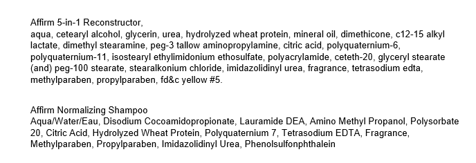 "Affirm 5-in-1 Reconstructor,A unique blend of micro and macro fibrous conditioners that is applied immediately after rinsing the relaxer from the hair and before the normalizing shampoo. While substantive conditioners are deposited well within the hair fiber.Affirm Normalizing ShampooThe multiple normailzing shampoor features: RR rich hydrating formula with advanced conditioning agents. R contain softer cleansers than beautifullyr features a color indicator to confirm normalization and removal of all traces of oilsr R benefits: RR cleans beautifully. R helps realign and close cuticlesr leaves hair tangle-free."Excluding returns for product defects, a returned item must be in new or unused condition, with all original materials included with the shipment. Refunds will not be given for items returned that do not meet these requirements.