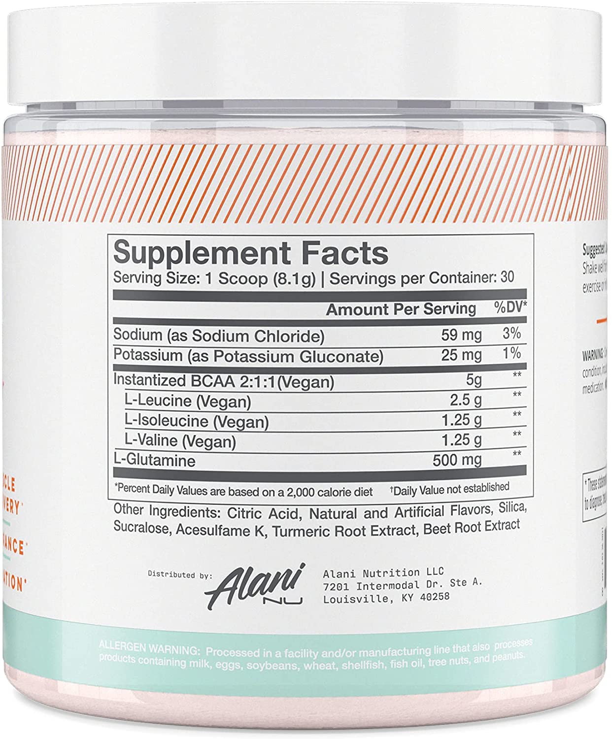 Alani BCAA offers a blend of Vegan InstAminos blend (.5 leucine, 1.25 isoleucine, 1.25 valine) to support muscle recovery. As a post-workout powder, it promotes muscle recovery, endurance, and hydration, while reducing muscle breakdown. Mixes easily with water and contains zero calories, zero carbohydrates, and zero grams of sugar.