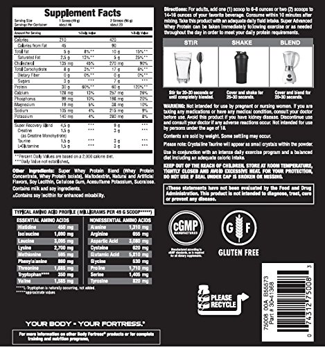 IMPROVED TRAINING RECOVERY: Body Fortress Super Advanced Whey Protein Powder is enhanced with creatine and other critical amino acids, allowing you to train harder and rebuild lean muscle faster, because tomorrow's workout starts with today's recovery.
