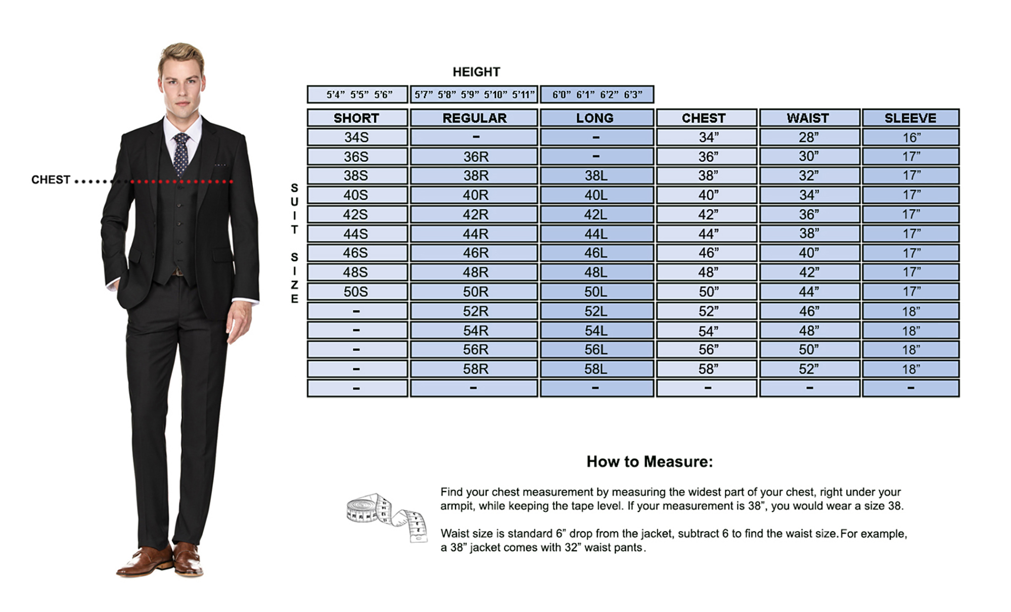 - For example, a 38” jacket comes with 32” waist pants.