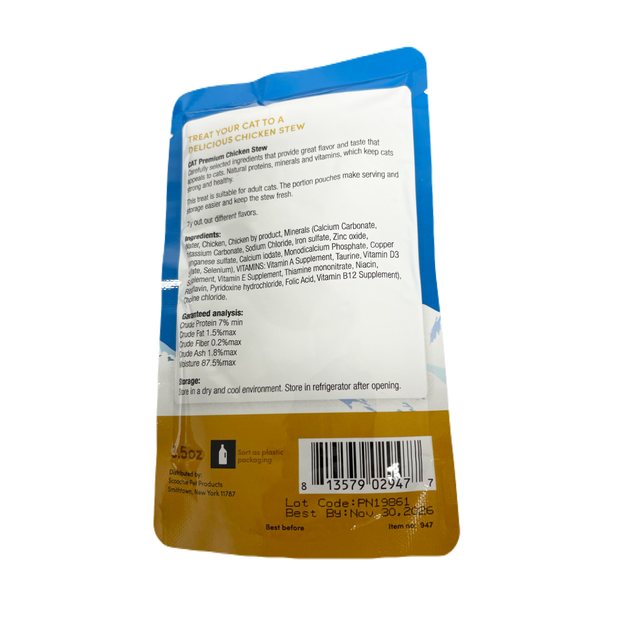 Treat your feline friend to the delicious and wholesome Scoochie Gravy/Stew Chicken or Salmon. Packed with high-quality meat in a flavorful gravy, this 3.5-ounce pouch is designed to satisfy your cat's cravings. The rich, savory taste and tender pieces make mealtime a delight, while the balanced nutrition ensures your cat stays healthy and happy. Made with natural ingredients and free from artificial additives, this is the perfect meal or complement to dry food. Your cat deserves the best—give them Scoochie Gravy/Stew and watch them purr with delight!