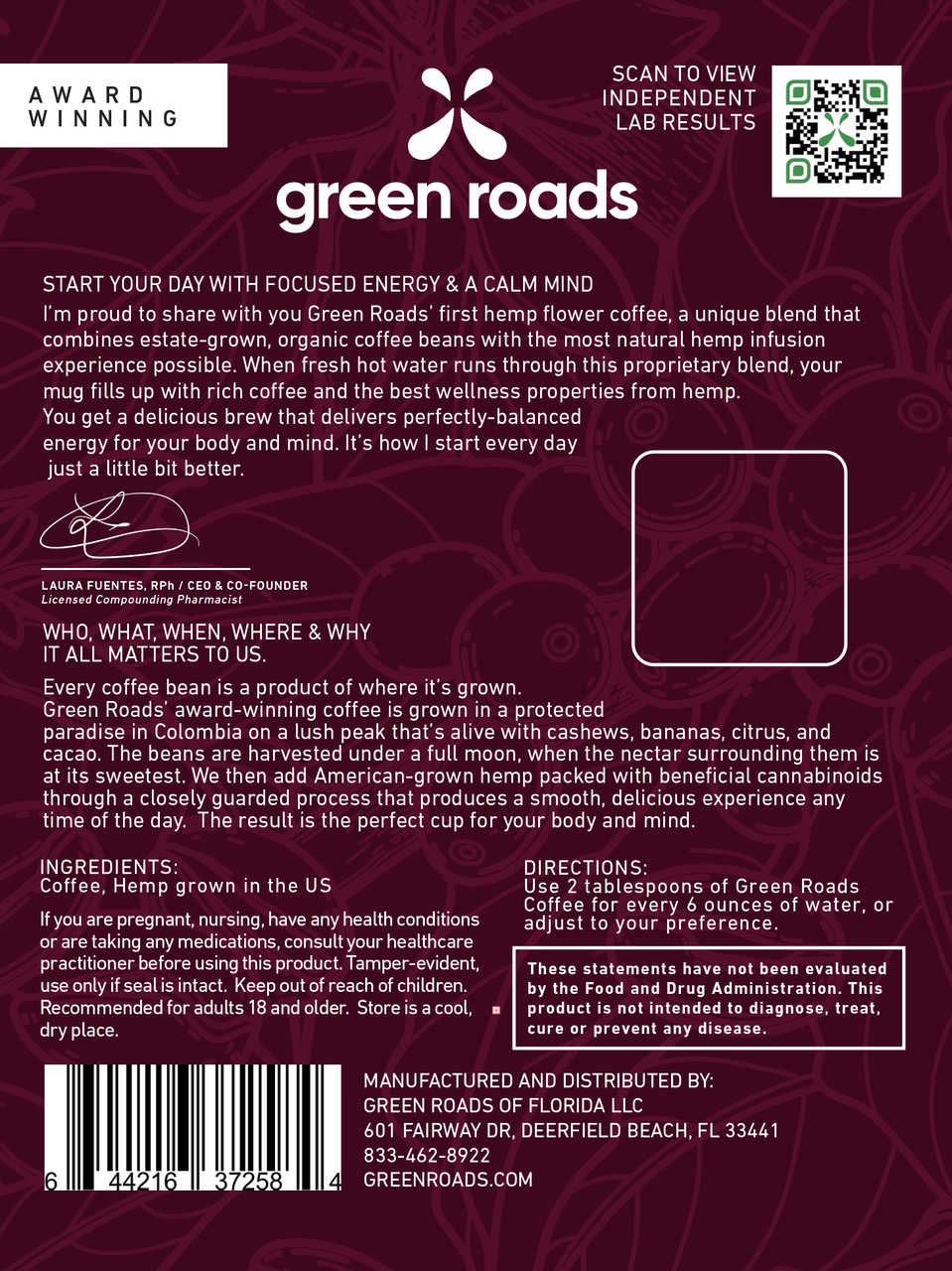 Founders Blend - Pour yourself a mug of Green Roads Hemp Flower coffee for a truly unique experience. Green Roads has combined gourmet Colombian coffee with American hemp to create a brew that offers you an energized body and an "in-the-zone" mind. Our coffee is grown in a protected paradise in Colombia that has been home to two generations of award-winning coffee. It's harvested under a full-moon, which is when the nectar surrounding the beans is at its sweetest. Our hemp is grown on select American farms with certificates of origin and analysis. This combination of premium ingredients creates our Founder's Blend, which offers a feeling and flavor far greater than the sum of its parts.Hazelnut -The toasty joy of hazelnut flavor meets a unique cannabinoid profile in Green Roads Hemp Flower Hazelnut coffee. Each bag contains coffee grown on a lush, protected estate in gorgeous Colombia. We use a closely guarded method to create a CBD coffee experience unlike any other. The result is a beverage that delivers rich, lavish flavor.French Vanilla -Delight in the rich taste of Green Roads Hemp Flower Vanilla Coffee. We believe we use the most natural and effective way to create a CBD coffee experience. Our coffee is grown in a protected estate in Colombia that is home to generations of award-winning coffee. Our hemp is grown on American farms with certificates of analysis. The result of combining these gourmet ingredients is a unique cannabinoid profile unlike any other coffee.This statement has not been evaluated by the Food and Drug Administration (FDA). This product is notintended to diagnose, treat, cure or prevent any disease.Hemp stalk derived. This product contains less than 0.3% THC. Must be 21 or older to order and receive this product. By placing an order for one of these items you are declaring that you are 21 years of age or over.The following states prohibit the shipping of hemp and hemp-derived products : Canada, Puerto Rico, Alaska, Hawaii, South Dakota, Idaho, NebraskaCannot ship to PO Boxes Hemp stalk derived. This product contains less than 0.3% THC.▪ KEEP PRODUCTS OUT OF THE REACH OF CHILDREN AND PETS.▪ Should not be used by women who are pregnant or breastfeeding, as its use may pose potential harms.▪ In case of accidental ingestion, contact the national poison control hotline at 1-800-222-1222 or 9-1-1.▪ Please Consume Responsibly.