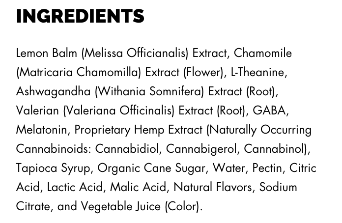 Put the “sweet” in sweet dreams with our delicious CBD gummies for sleep! Our Sleep-Aid Gummies are made with our proprietary Superior Broad and Full Spectrum CBD formula, along with melatonin, L-theanine, GABA, and a suite of soothing herbs infused with a lip-smacking raspberry flavor. FDA Disclaimer:This statement has not been evaluated by the Food and Drug Administration (FDA). This product is not intended to diagnose, treat, cure or prevent any disease.THC Content:Hemp stalk derived. This product contains less than 0.3% delta-9 THC.Age Limit:Must be 21 or older to purchase and redeem. By purchasing this you are declaring that you are 21 years of age or over.KEEP PRODUCTS OUT OF THE REACH OF CHILDREN AND PETS.Should not be used by women who are pregnant or breastfeeding, as its use may pose potential harms.In case of accidental ingestion, contact the national poison control hotline at 1-800-222-1222 or 9-1-1.Please Consume ResponsiblyState Restrictions: The following states prohibit the shipping of hemp and hemp-derived products: Canada, Puerto Rico, AK, HI, SD, ID, NE, or any PO Boxes
