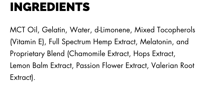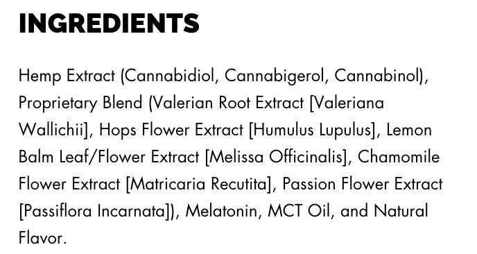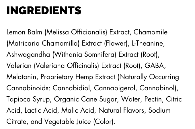 - Serving Size in Milligrams: 2 mg THC + 200 mg CBD + 25 mg CBN + 25 mg CBG per serving