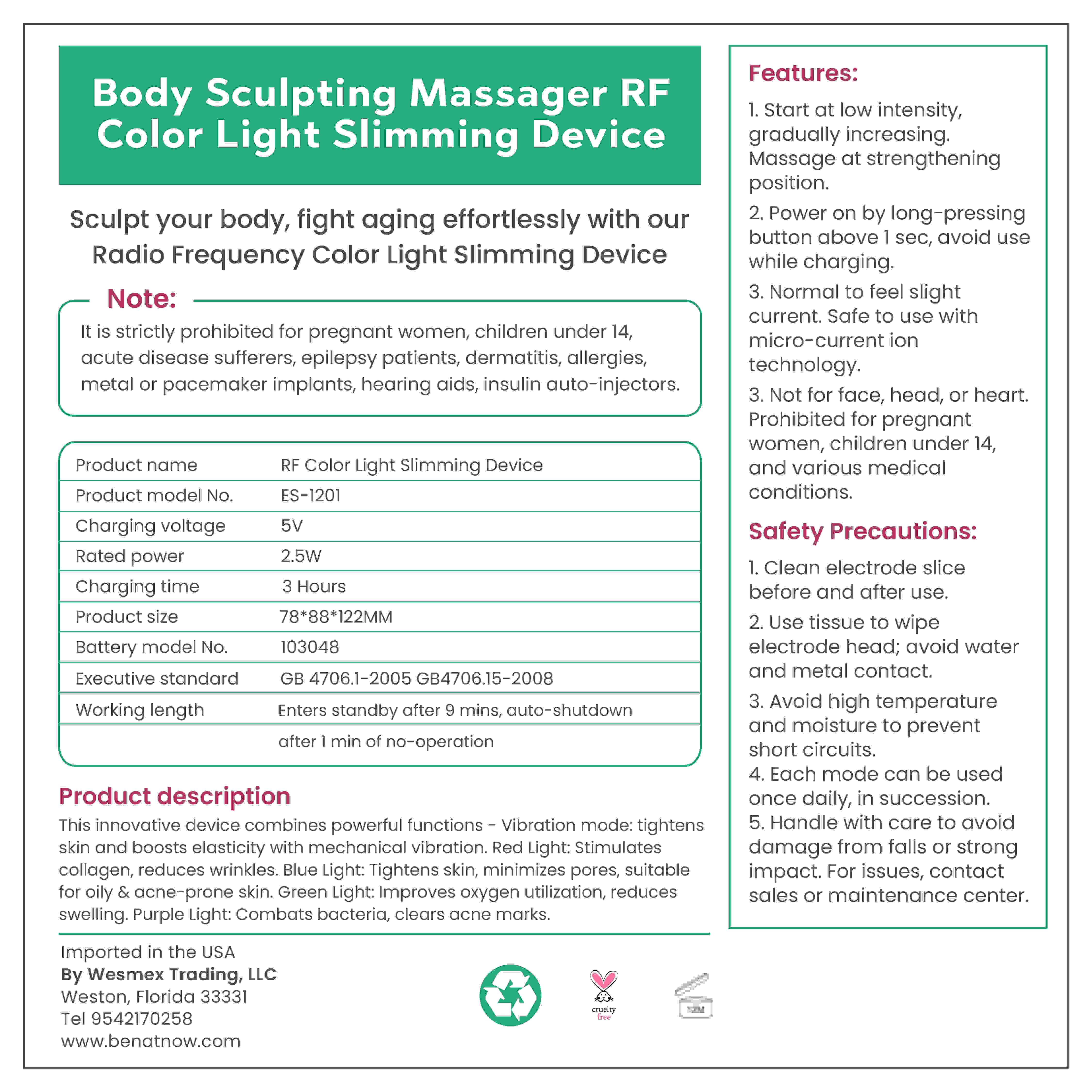 The Cellulite Body Sculpting Massager is the ultimate solution to your body's aches, pains, and cellulite! This powerful and effective massager is designed to provide a range of benefits for your body, from reducing tension and pain to improving sleep and overall well-being. Made from high-quality ABS material, this massage tool provides a powerful yet gentle vibration massage, relaxing and rejuvenating your muscles.With its four massage heads and adjustable speed settings, the Cellulite Body Sculpting Massager is perfect for targeting stubborn cellulite, relieving muscle soreness, and improving blood circulation. The portable and convenient design makes it easy to use at home or in the office, so you can enjoy a relaxing massage whenever and wherever you need it.Dimensions: 9in x 7in x 5 inVoltage:AC 110V/220V(single voltage)Frequency:50/60Hz. Power: 28W.Weight: 1.1 lbs.Massage Heads:4 massage headsDirections for Use: Preparation: Ensure your skin is clean and dry before use. Apply a suitable lotion or oil to your skin for a smoother massage experience. Operation: Power On: Plug the massager into a power outlet and turn it on using the power button. Select Intensity: Choose your desired intensity level using the control buttons. Apply to Skin: Place the massager head on the targeted area of your body. Massage: Gently glide the massager in circular motions over the desired area. Adjust Position: Adjust the position of the massager to reach different areas of your body. Tips for Optimal Use: Consistent Use: For best results, use the massager regularly. Gentle Pressure: Apply gentle pressure to avoid discomfort. Listen to Your Body: If you experience any pain or discomfort, stop using the massager and consult a professional. Cleaning and Maintenance: Unplug the massager before cleaning. Wipe the device with a damp cloth. Avoid using harsh chemicals or abrasive cleaners. Store the massager in a cool, dry place. Remember: While the massager can help alleviate muscle tension and reduce the appearance of cellulite, it is not a substitute for a healthy lifestyle. Maintain a balanced diet, exercise regularly, and consult with a professional for any health concerns.