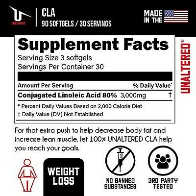 CLA is a natural, omega-6 fatty acid. Also known as conjugated linoleic acid, CLA's main active ingredient is pure safflower oil extract, which is derived from Safflower plants. Based on clinical studies, this natural weight loss supplement is shown to induce fat loss in the belly, support the immune system and enhance overall body composition. Where most CLA supplements use 1250 to 2500 milligrams, UNALTERED CLA uses the clinically studied dose of 3000 milligrams for the best results. ALL NATURAL INGREDIENTS - 100% pure safflower oil softgels for weight loss STOMACH FAT LOSS – Enhance stomach and abdominal fat body composition PRESERVE LEAN MUSCLE - Support lean muscle growth while slimming the mid-section MAX STRENGTH CLA PILLS - Highest concentration of all-natural safflower oil NON STIMULANT FORMULA - Caffeine free and jitter-free, non-stimulant weight loss REDUCE BLOATING - Supports better digestion to reduce bloating and prevent constipation Read more HOW TO USE: UNALTERED CLA BY ITSELF: · Take 3 soft gels daily; one with breakfast, lunch and dinner. Or, as suggested by a healthcare practitioner UNALTERED CLA with UNALTERED Diet Pills · Take 3 soft gels daily; one with breakfast, lunch and dinner. Take 3 capsules of UNALTERED Diet Pills in the morning before breakfast. Take 3 more capsules of UNALTERED Diet Pills in the afternoon before lunch. Alternatively, take the last 3 capsules of UNALTERED Diet Pills 30 minutes before a workout. For optimal weightloss results, drink at least 64 ounces (about 8 glasses full) of water to help detox the body and support the loss of abdominal fat. Furthermore, follow a calorie-controlled diet & exercise program. TAKE WITH UNALTERED DIET PILLS IF YOU WANT TO: Increase your metabolism to support more overall calorie consumption Suppress hunger cravings and overall appetite Enhance mental focus & clarity while losing weight Read more HIDDEN BENEFITS HEALTHY METABOLISM SUPPORT UNALTERED CLA helps to maintain a healthy metabolic rate so that you burn more calories throughout the day. For optimal results, use the CLA with the UNALTERED Diet Pills (you can see more details on the UNALTERED Diet Pills under the "Frequently bought together" section, right below the main image of the product at the top of this page. PRESERVE LEAN MUSCLE We all know that muscle burns more calories than fat, so regardless if your goal is to step on stage, or simply burn off that stubborn belly, you should try and maintain as much lean muscle mass on your body as possible. UNALTERED CLA will allow you to preserve your precious muscle while targeting that unwanted stomach fat. NATURAL, CAFFEINE-FREE ENERGY UNALTERED CLA is a non-stimulatory weight loss supplement, which means that it does not contain harsh stimulants like caffeine, in which restrict blood flow and promote energy crashes later on in the day. We understand that you have a life beyond the gym, so UNALTERED CLA may help give you that added energy boost you need to conquer your daily routine. IMPROVED SENSE OF WELL-BEING Studies show that slimming down and losing weight in general, have dramatic impacts on the way we view ourselves. As a matter of fact, taking a weight loss supplement alone has been shown to positively affect the way we think and feel, knowing that we are taking a step in the right direction towards a healthier life.