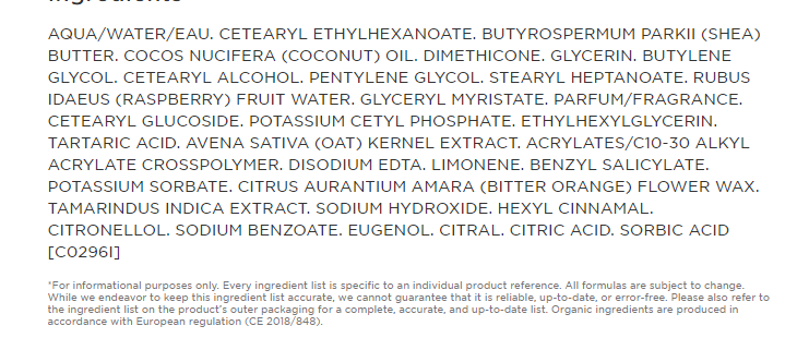 A moisturizing body lotion, formulated with 88% natural ingredients including ultra-nourishing Shea Butter, soothing Organic Raspberry water, gently exfoliating Tamarind pulp acids and visibly firming Organic Oat sugars—that soften and intensely hydrate even very dry skin for long-lasting comfort. Body Lotion is enriched with naturally-sourced ingredients that boost hydration and protect the skin from the dehydrating effects of sun, cold, heating, and air-conditioning.