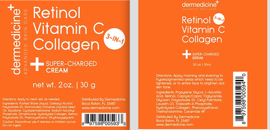 Dermedicine 3-in-1 Anti-Aging Super Charged Bundle: Serum 1oz & Cream 1ozAbout the BrandDermedicine is a premium skincare line formulated by a leading dermatologist and proudly manufactured in the USA3 in 1 SERUM:Benefits3 in 1 super formula to brighten and lightenHelps to reduce appearance of fine lines and wrinklesSuitable for all skin typesDirections for UseTo use, wash face using a cleanser and pat dry. Avoiding direct eye contact, apply a thin layer of serum to hyperpigmented areas which need to be brightened, or to entire face to brighten dull skin tone and allow to dry. Apply twice daily (AM / PM). Can be worn under moisturizer and makeup. Caution: Discontinue use if redness or irritation occurs. Do not ingest.SpecificsVolume: 1fl. oz. (per bottle)3 in 1 CREAM:Benefits3 in 1 super formula to brightenHelps to reduce appearance of fine lines and wrinklesSuitable for all skin typesDirections for UseOur super charged anti aging cream is a powerhouse combination of Retinol, Vitamin C and Collagen to help your complexion appear more even, youthful and bright while helping to fade the appearance of fine lines and wrinkles, blotchiness, dark spots, hyper pigmentation and unevenness that becomes more apparent as we age. It is suitable for both men and women of all skin types and tones including normal, sensitive, mature, older, fair to darker skin tones such as African-American, Asian, Latin, Indian and Mediterranean. To use, wash face using a cleanser and pat dry. Avoiding direct eye contact, apply a thin layer of cream to entire face and allow to absorb. Apply twice daily (AM / PM). Can be worn under moisturizer, sunscreen and makeup. Caution: Discontinue use if redness or irritation occurs. Do not ingest.SpecificsVolume: 1fl. oz. (per bottle)The Power of RetinolRetinol, a form of vitamin A, promotes smooth, beautiful skin at a cellular level. This results not only in younger-looking skin, but also a face that’s better prepared to age gracefully.The Power of Vitamin CVitamin C is a supplement known for it’s powerful antioxidant properties. Specifically it works to brighten complexion and add an overall healthy glow to skin. It also may reduce the appearance of fine lines, wrinkles, and dark spots while working to improve skin tone and clarity.The Power of CollagenCollagen is a protein that is responsible for skin strength and elasticity, and is known to be the most abundant in the body. Collagen support Peptides work to boost and restore a youthful appearance to the skin for a more supple feel and hydrated look.