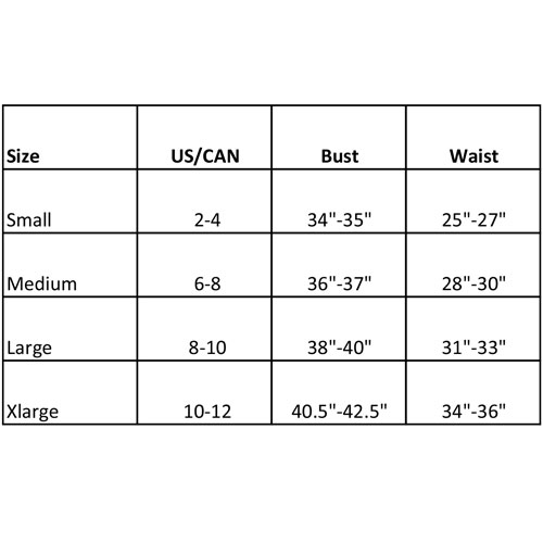 - Small (2-4), Medium (6-8), Large (10-12), XL (12-14)