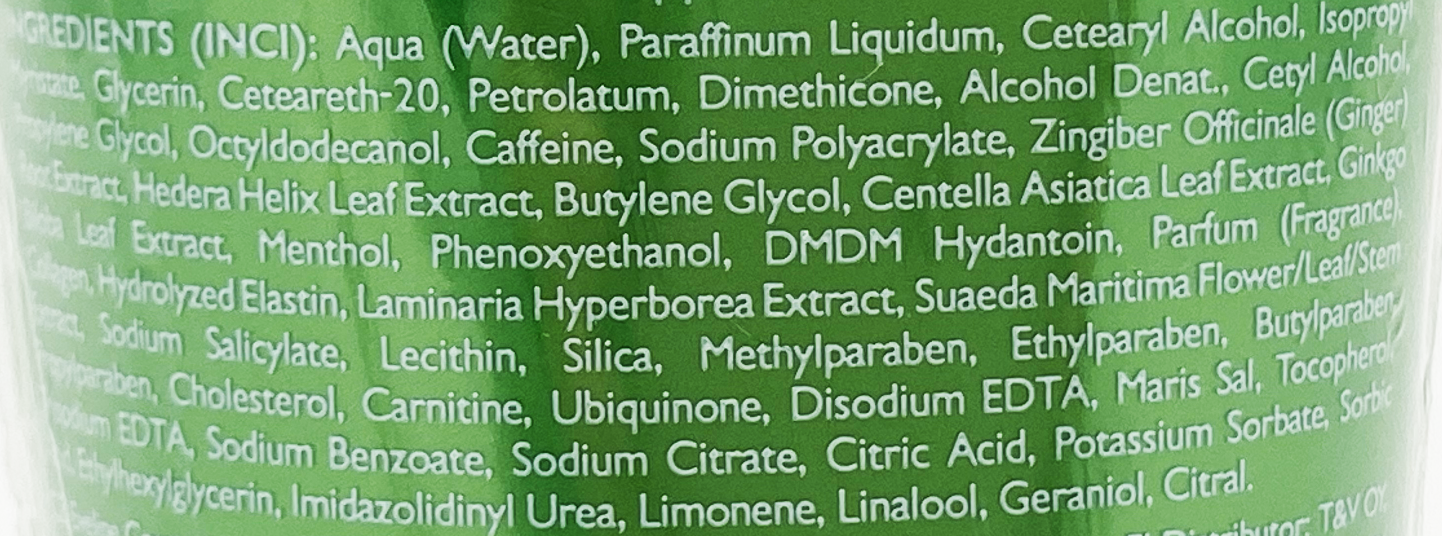 Reduces appearance of cellulite, and visibly corrects contour. Improves skin elasticity and firmness. This advanced intensive Thermo Active formula, delicately warms up the skin, enabling instant penetration of active substances in to the epidermis, assuring maximum results. Additionally, stimulates micro-circulation in areas covered by cellulite, which significantly accelerates smoothing unevenness, improving skin elasticity and firmness. ACTIVE INGREDIENTS: Thermo Fat Burner - actively reduces deposits of fats, effectively removes stored lipids. MDL Complex - smooths hypodermic unevenness as well as improves skin elasticity and firmness. Caffeine - stimulates metabolism and burning of fatty cells. Ivy and Horsetail Extract - support collagen and elastin production. Laminaria Algae - rich in mineral salts, deeply moisturize, soothe and eliminate toxins from tissues, additionally reinforcing the skin.